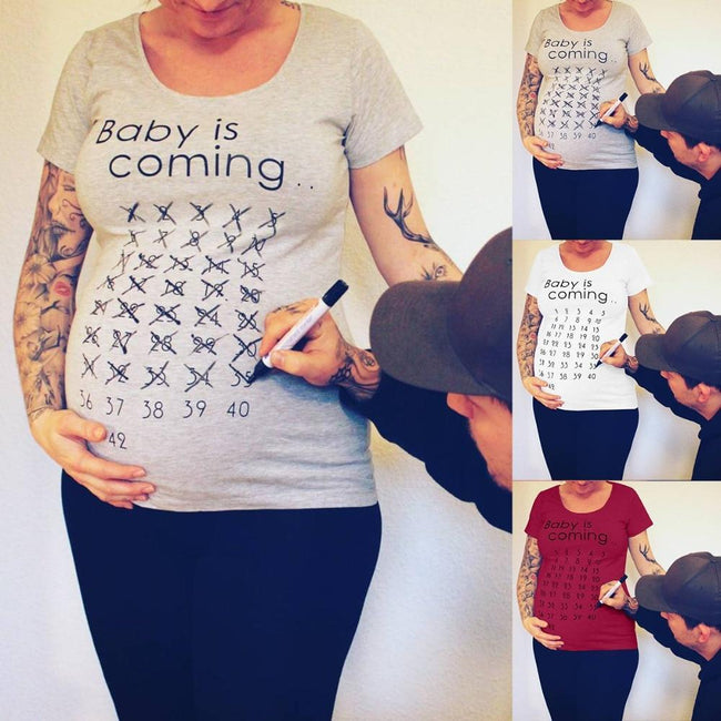 Our Baby Countdown Shirt is a fun and creative way to keep track of your pregnancy. The women's maternity shirt features a weekly countdown calendar. Cross off the weeks as you progress through your pregnancy. Cute, fun, and interactive for both mom and dad!
