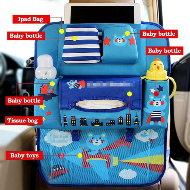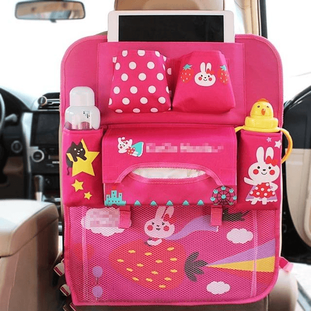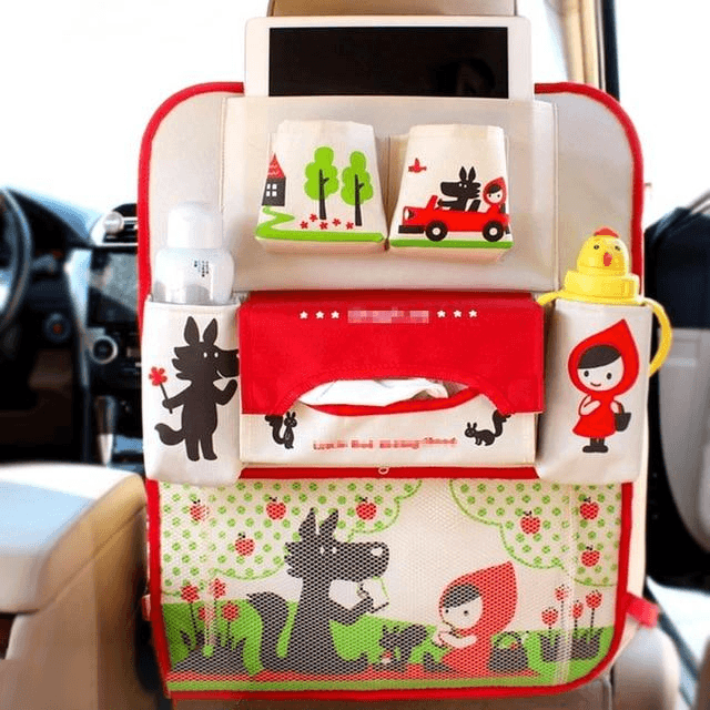 Our Backseat Baby Organizer keeps your car clean, your baby products organized, and your baby happy! The organizer fits on the back of your car seat and has pockets for bottles, wipes, toys, and more.