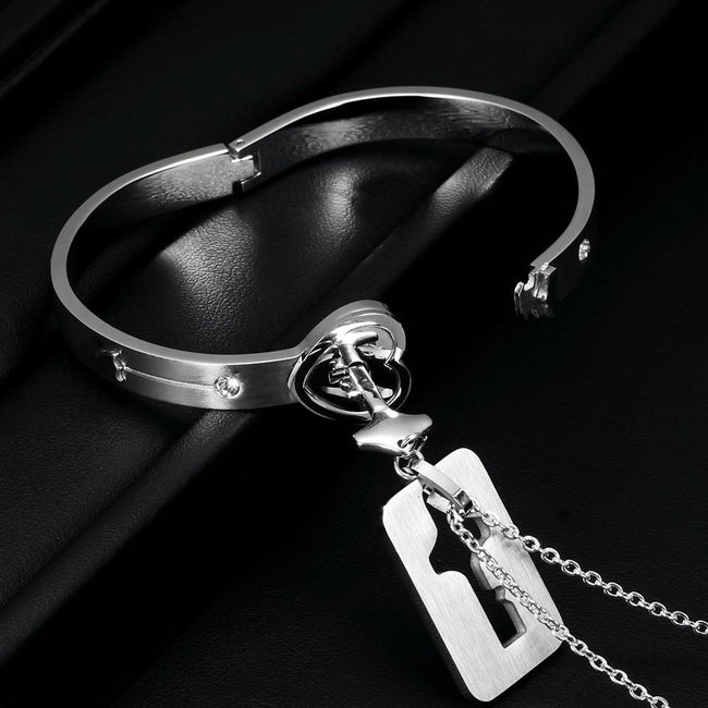 The Commitment Set is a modern and unique set which complements each other in a way that the necklace serves as the key to opening the bangle bracelet. The set comes in an elegant silver finish.