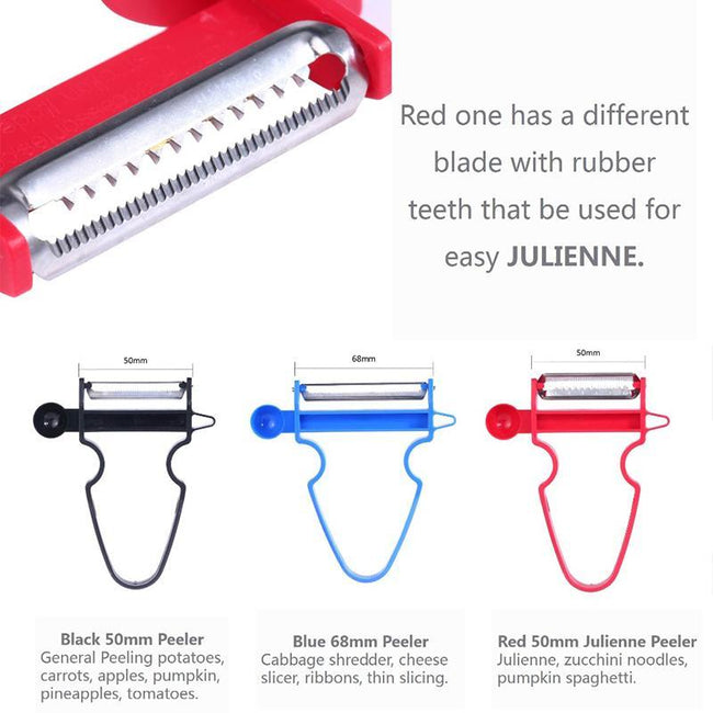 Our Easy Peel allows you to have the perfect set of three peelers you'll ever need in your kitchen. The sets include 3 peelers: Black (Standard peeler), Blue (Professional Peeler), and Red (Julienne Peeler).