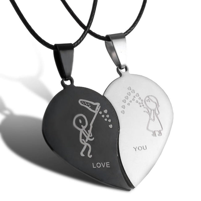 Show off your love for your partner with our Other-Half Necklaces. They're perfect for showing that your boyfriend or girlfriend is your other half. The necklace set comes with one chain for you and one for your partner. Each features a cute stick figure design. Put the necklaces together to complete the design and make the heart whole.