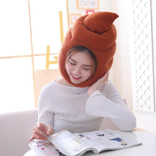 Our Poop Head is a funny novelty item that looks creative and funny on anyone. It's also an earmuff that blocks sounds while cushioning your head while you sleep. Wear it during any costume event, and you'll be the center of attraction and humor!