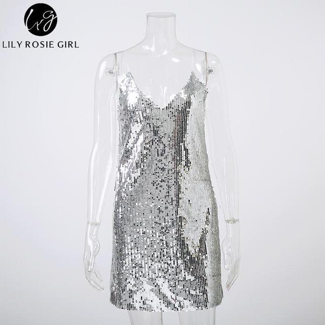 Look your best in our Starlet Dress. The silver sequin dress is the perfect statement piece for any party, club, or special occasion. It features spaghetti straps, a deep v-neck, and a short and trendy length.