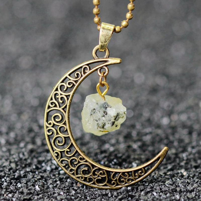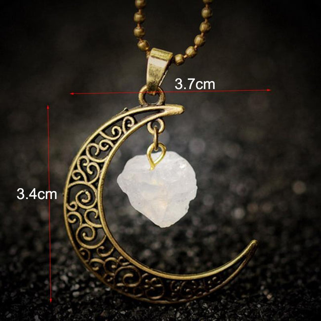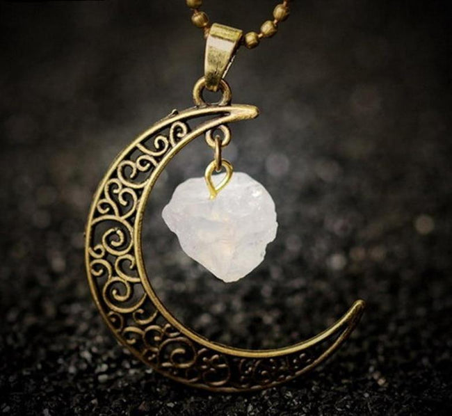 Our Vintage Crystal Moon Necklace is a beautiful pendant necklace in a stunning antique design. The necklace features a crescent moon and a raw crystal stone. It's perfect for completing your vintage style and displaying spiritual side.